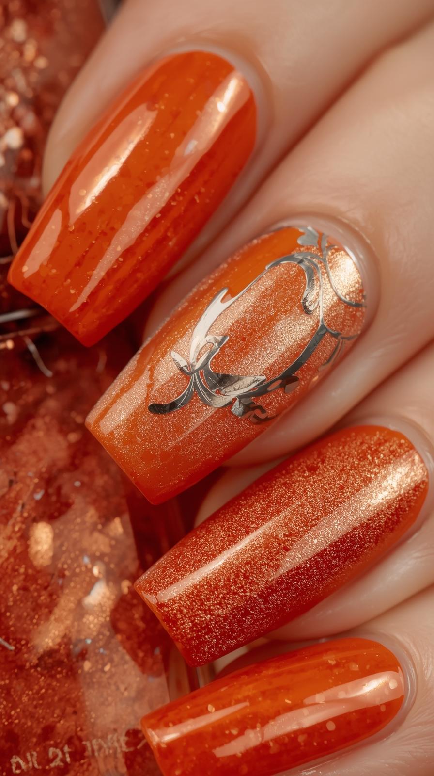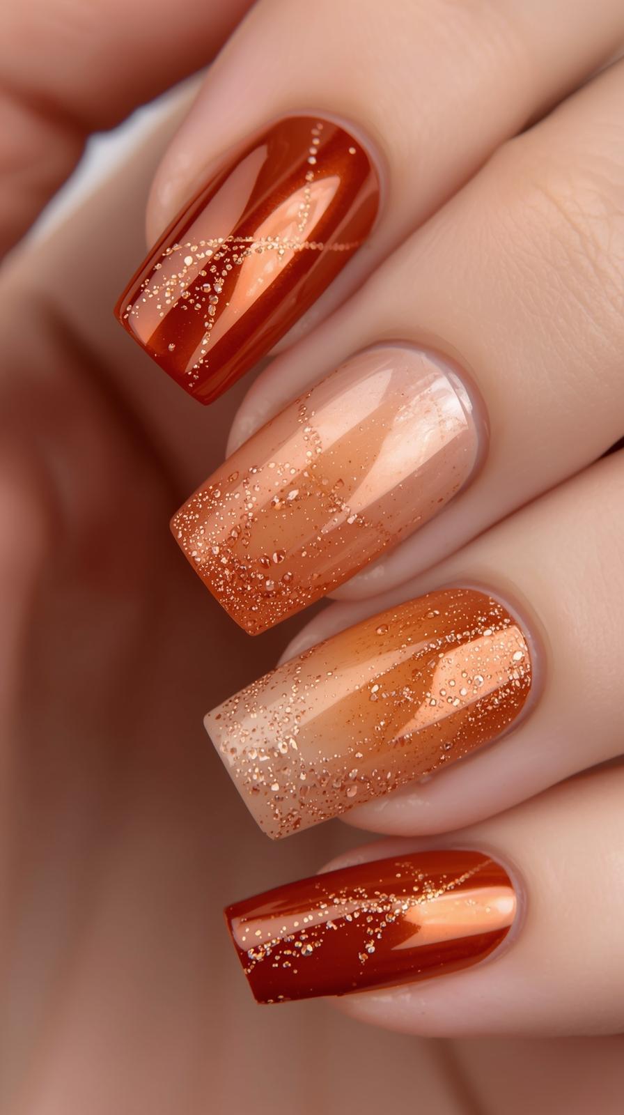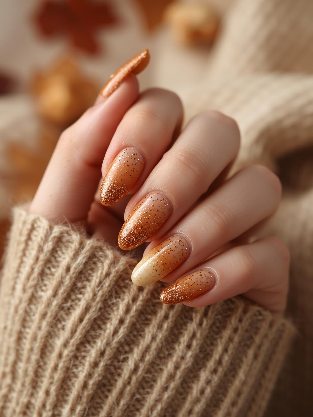 Blend shades of orange and gold for a pumpkin spice ombre effect. This design embodies the warmth of fall while adding a playful twist to your manicure.
