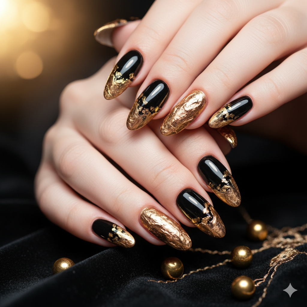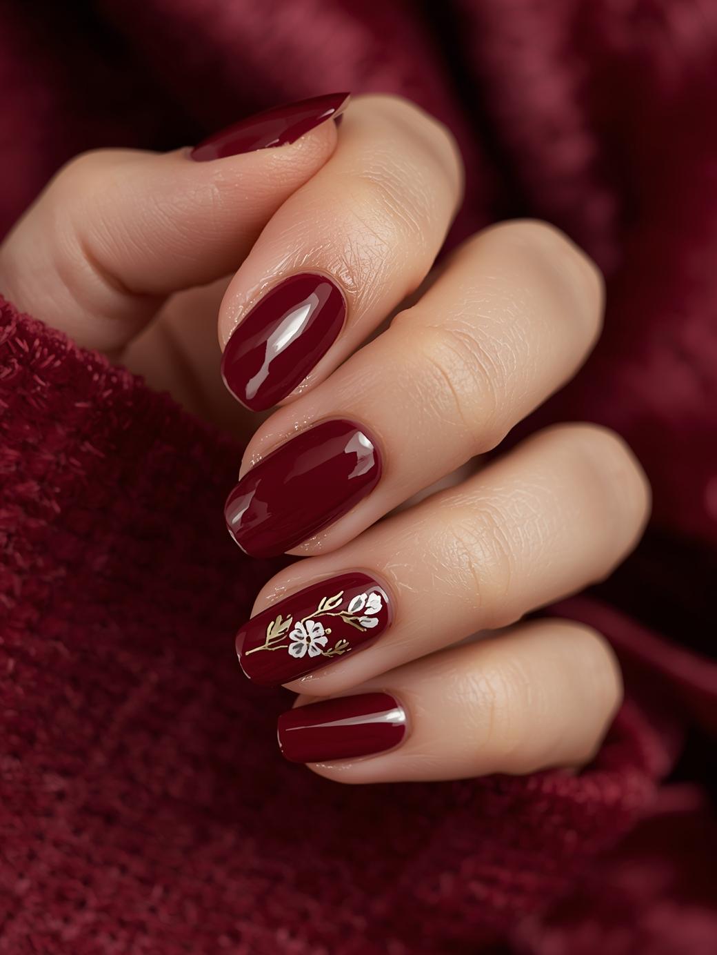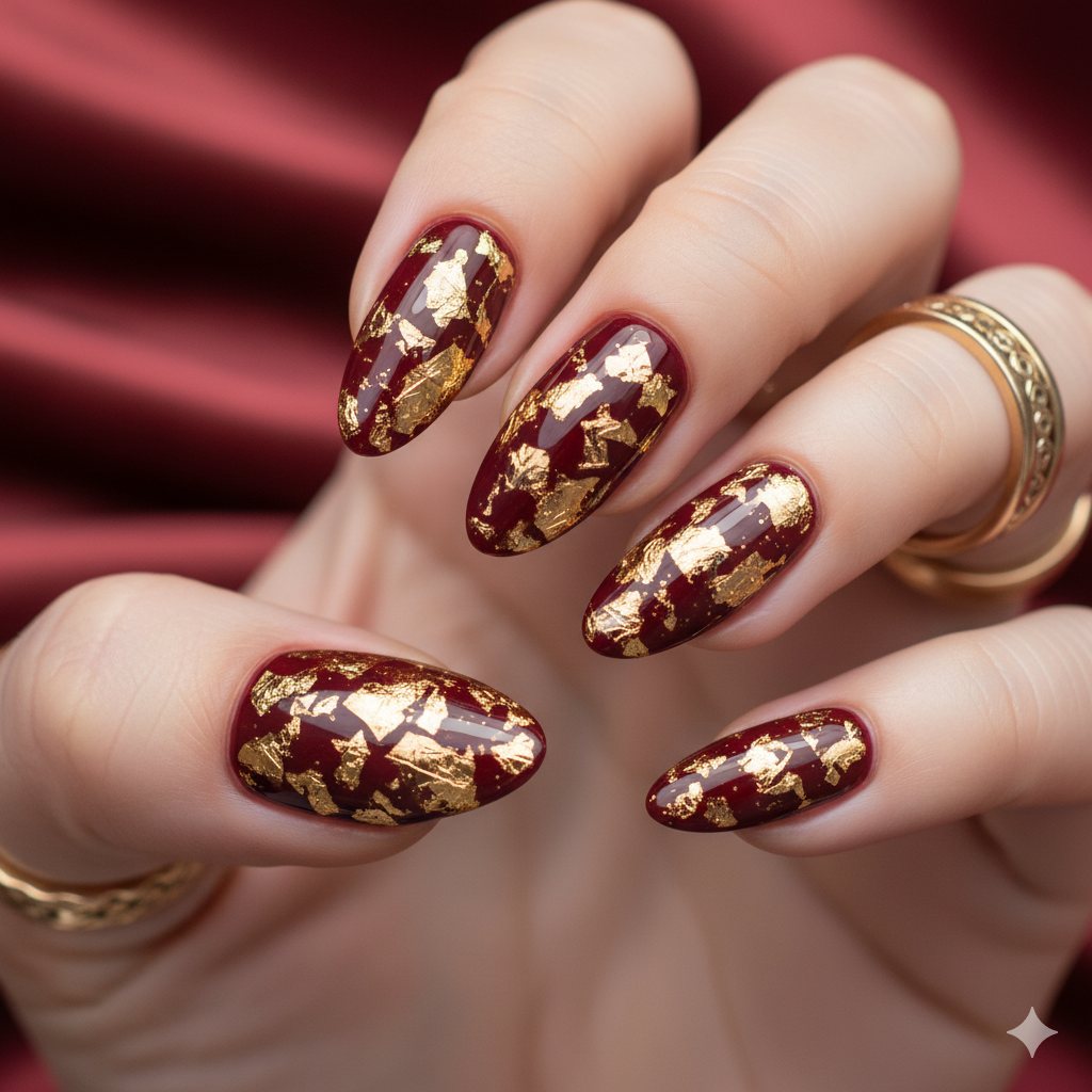 Maroon nails with gold foil detailing add a touch of sophistication. This look combines rich fall colors with a hint of luxury and sparkle.