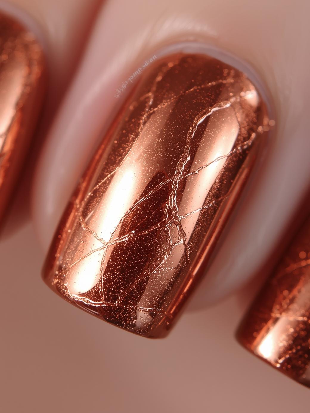 Metallic copper nails add instant glamour to your look. The reflective finish captures the glow of autumn sunsets beautifully.