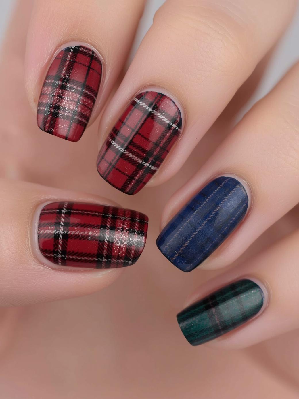 Inspired by cozy fall flannels, plaid nail designs add a rustic and stylish touch. Combine warm tones like red, beige, and black for an authentic autumn vibe.