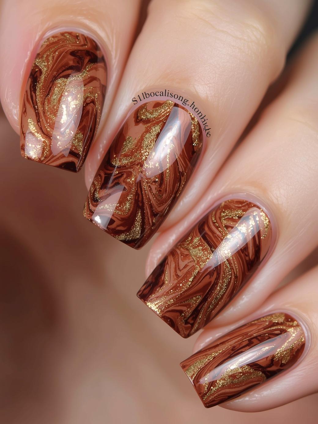 Tortoiseshell nails mimic the pattern of the classic accessory. The warm mix of amber, brown, and black tones is perfect for an elevated fall aesthetic.