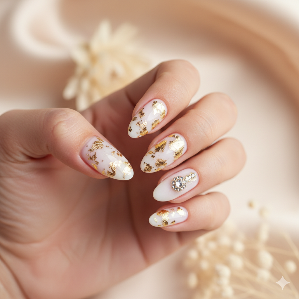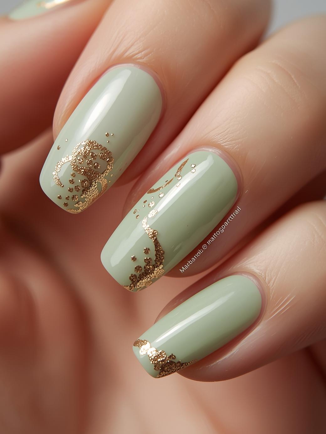 Add a touch of art to your nails with gold leaf detailing over a neutral base. This luxurious design reflects the golden hues of fall foliage.