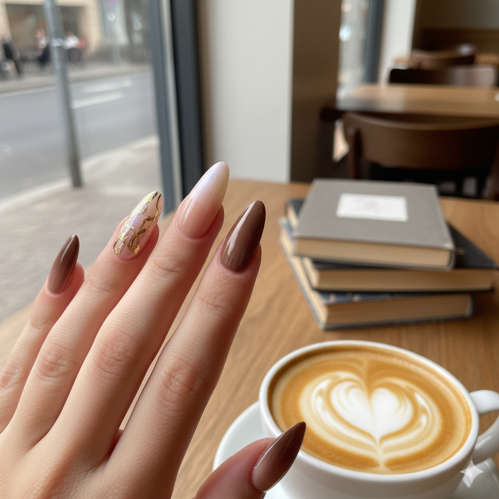 A mocha gradient nail design blends light coffee shades into darker tones for a soft, cozy look that’s perfect for autumn.