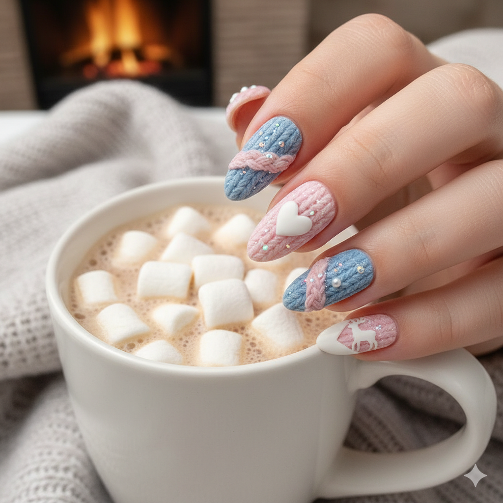 A cozy trend this season, sweater texture nails mimic knit patterns using 3D detailing. Try them in neutral tones for a soft, seasonal finish.